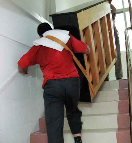 4、如果钢琴要搬上楼,最好也要有四至五个人。首先要保证搬琴人的安全,同时钢琴不能碰撞、划蹭,外表的保护重于内部。钢琴的背面朝墙壁,键盘朝楼梯的扶手。两人在下,三人在上,最好用宽布带挎在肩上兜住钢琴的车脚。同时用手抓住琴背的把手和键盘底下(不能拉钢琴的腿),抬起钢琴一鼓作气搬上一层楼再休息。特别要注意的是,键盘的一侧不能碰扶手,车脚不能碰楼梯。到一层楼面拐弯时要当心碰撞、调整好方向然后再抬起往上搬。进房门时,也要当心蹭着门框,保证最后安全地把钢琴放到安排好的位置上。